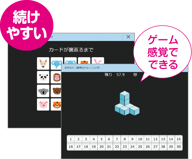 クラスは無学年制なので、やりたいときから、いつでもスタートすることができます。パズルは、1 レベル~100 レベルまで。1 回の授業で 1 レベル上がることを目安に、モチベーションの継続もサポートしています。また、長く続けていても「慣れ」や「飽き」がこないように、様々なタイプのパズルを取り揃えています。